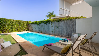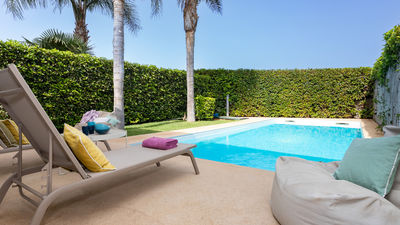 La villa è circondata da un giardino di 250 mq delimitato da muri ricoperti di piante rampicanti. Il prato pianeggiante è intervallato da alberi di limoni e arbusti fioriti, mentre terrazze e sentieri piastrellati conducono alla zona solarium. Le porte-finestre della zona giorno si aprono su una terrazza attrezzata con mobili da esterno. Il parcheggio è disponibile appena fuori dal cancello pedonale, con spazio per due auto.N.B.: Si precisa che i servizi fotografici solitamente vengono realizzati in primavera, pertanto i colori e le fioriture dei giardini, dei prati e dei parchi potrebbero essere diversi al momento del vostro ingresso in villa.