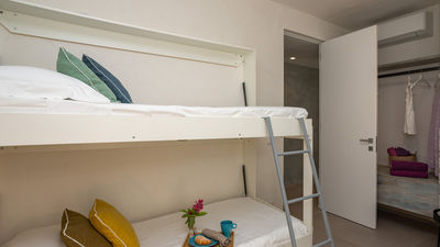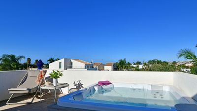 La villa si sviluppa su un unico piano, per una superficie di 80 mq. PIANO TERRA - Zona giorno a pianta aperta con salotto, smart tv e tavolo da pranzo; cucina compatta con accesso al giardino; camera matrimoniale con bagno privato con doccia; seconda camera con letto a castello per quattro persone; bagno con doccia. Entrambe le camere hanno accesso diretto al giardino. Una scala esterna conduce a una terrazza sul tetto con vasca idromassaggio, che offre una vista panoramica.