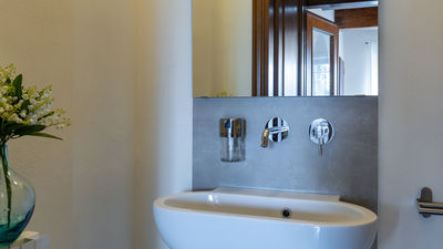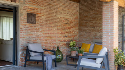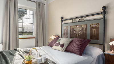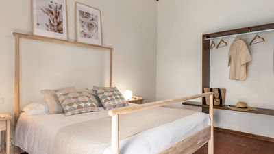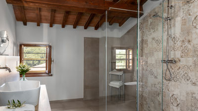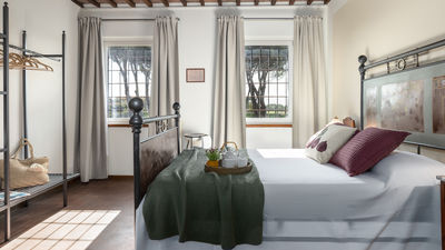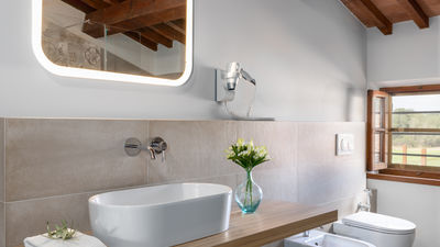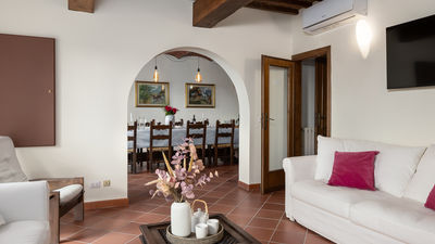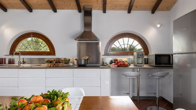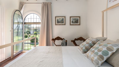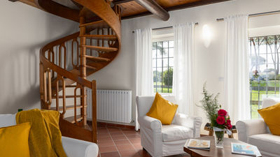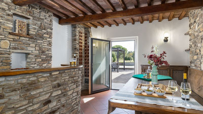 Interni:Il casale si sviluppa su due piani. PIANO TERRA - Ingresso principale situato sotto il portico che conduce a una zona giorno con divani, ampia cucina, sala tv e zona pranzo che si collegano a uno spazio multifunzionale e un bagno per gli ospiti. Adiacente al portico esterno si trova un bagno per gli ospiti con lavatrice. PRIMO PIANO - Due camere matrimoniali, una camera doppia e due bagni con doccia. Sempre al primo piano con accesso tramite una scala a chiocciola in legno, si trova la suite con camera matrimoniale e bagno en-suite con doccia. Aria condizionata nelle camere e zona living.