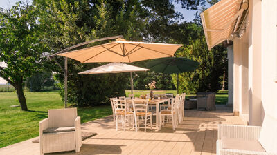 La villa è circondata da un giardino pianeggiante, completamente recintato, di circa 5000 mq, ombreggiato da alberi maturi. Direttamente fuori dalla cucina nell'unità 1 si trova un'area pranzo esterna pavimentata, arredata con tavolo, sedie, divano, poltrone, ombrelloni, tende e un barbecue incorporato. A breve distanza dalla casa si trovano un campo da beach volley, un'area giochi per bambini e una doccia con acqua fredda. Un piccolo spazio recintato davanti alla villa ospita alcuni piccoli animali da fattoria. C'è un parcheggio non coperto per un massimo di otto auto appena oltre il cancello d'ingresso.