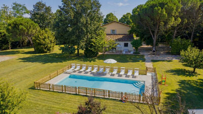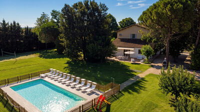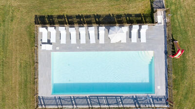 La piscina si trova a circa 25 m dalla villa ed è raggiungibile tramite un sentiero in ghiaia. Di forma rettangolare, misura 12 x 5 m con una profondità costante di 1,40 m; rivestita in PVC; impianto di depurazione a cloro; illuminazione interna; accessibile tramite quattro gradini romani sommersi. L'area circostante per prendere il sole è completamente recintata e attrezzata con lettini, ombrelloni e una doccia con acqua fredda. La piscina è aperta dall'ultimo sabato di aprile fino al primo sabato di ottobre.
