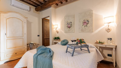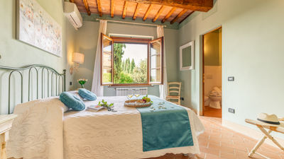 Circa ottocento metri quadrati di parco fanno da cornice al casale, delimitato su un lato (che confina con l’altro casale) da una discreta siepe. Nel bel giardino accudito, arricchito con tante fioriture colorate, cespugli di ginestre alternate ad una giovane collezione di cipressi e di ulivi che punteggiano il viale d’ingresso ed incorniciano l’area piscina, trova spazio il gazebo con tavolo e sedie per pranzare all’aperto. A pochi metri, in prossimità della piscina, è allestita una struttura in muratura con barbecue. Per momenti di relax al fresco, invece, si potrà approfittare dell’area salotto predisposta sotto il largo porticato al piano inferiore. La proprietà è dotata, infine, di due aree adibite a zona parcheggio, la prima davanti all’ingresso principale e la seconda davanti al porticato del piano inferiore, raggiungibile direttamente dal cancello d’ingresso (condiviso con Casale Fienile).N.B.: Si precisa che i servizi fotografici solitamente vengono realizzati in primavera, pertanto i colori e le fioriture dei giardini, dei prati e dei parchi potrebbero essere diversi al momento del vostro ingresso in villa.