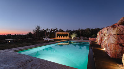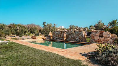 La piscina si trova a circa 30 m dalla villa e si raggiunge attraverso un percorso nel giardino. Forma rettangolare, con dimensioni 6 x 16 m con profondità 1,40m. Rivestita con telo in pvc, con gradini laterali di accesso e una penisola all’ingresso di un metro circa, che funge da piattaforma o zona relax. Dotata di illuminazione interna e nella zona circostante. Area solarium con lettini e gazebo. Depurata a cloro. Aperta dall’ultimo sabato di aprile al primo sabato di ottobre.