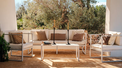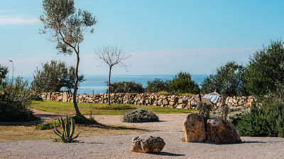 Il terreno si estende per circa 8.000 mq, con prato, macchia mediterranea e piante aromatiche come rosmarino, lavanda e timo. Il giardino è progettato per valorizzare la vista mare dai livelli superiori, con zone salotto posizionate per godere del paesaggio circostante. Un portico con arredi da esterno è accessibile dalla zona giorno, mentre la cucina si apre su un’area pranzo all’aperto dotata di barbecue e cucina esterna.