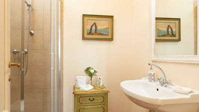 Villa Iole si estende su una superficie di circa 450 mq distribuiti su due piani ed è suddivisa in quattro unità abitative indipendenti, ciascuna con accesso privato: UNITÀ 1 (Piano terra) - Salone con cucina;, una camera matrimoniale; una camera doppia, un bagno con doccia. UNITÀ 2 (Piano terra) - Salone con cucina; una camera matrimoniale; una camera matrimoniale con letto divisibile; due bagni con doccia. UNITÀ 3 (Primo piano) - Accesso tramite scala esterna alla loggia con porta d’ingresso. Composta da una camera matrimoniale; una camera matrimoniale con letto divisibile (entrambe con bagno en-suite con doccia, uno no bidet); una camera doppia; un bagno con doccia. UNITÀ 4 (Primo piano) - Accesso tramite scala esterna alla loggia con porta d’ingresso. Include una camera matrimoniale con bagno en-suite e doccia; una camera matrimoniale con letto divisibile; una camera doppia con bagno en-suite e doccia (no bidet e un ulteriore bagno con doccia. Zone comuni: al piano terra, con accesso indipendente, si trovano una spaziosa sala da pranzo e una cucina professionale, accessibile anche dall’esterno, e un bagno con doccia (no bidet). È presente una lavanderia adiacente all'ingresso della cucina. Aria condizionata solo nelle camere da letto.