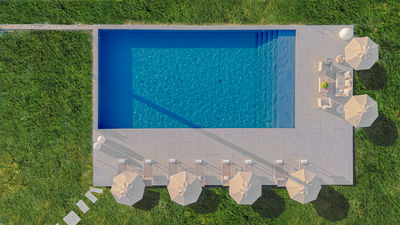 La piscina si trova nella parte estrema del giardino, facilmente raggiungibile percorrendo il prato. Forma rettangolare, con misure 14x7 m e profondità di 1,50 m. Rivestita in pietra naturale e dotata di scala romana di accesso e di luci interne. Depurazione a cloro e a sale. Area solarium pavimentata in pietra naturale grigia, con lettini e ombrelloni, due gazebo con salotto e tavolino nella zona a prato, doccia con acqua fredda. Aperta dall’ultimo sabato di aprile al primo sabato di ottobre.
