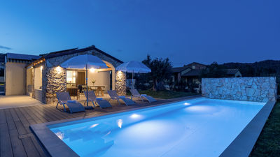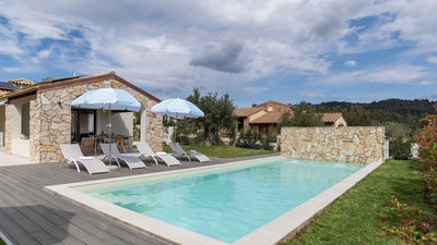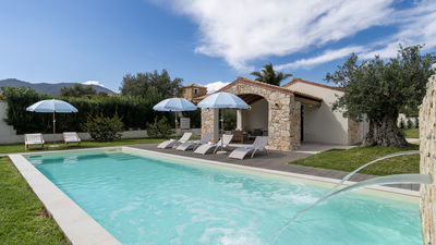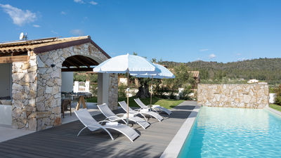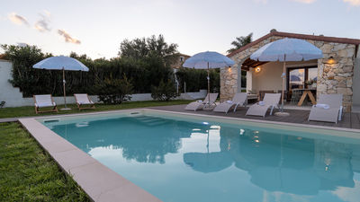 La piscina è adagiata su un terreno pianeggiante a pochi passi dal portico. Di forma rettangolare, misura 10 m x 4 m e ha profondità di 1,40 m. Rivestita in pvc e con accesso attraverso 5 gradoni sommersi; dotata di fari interni cangianti e impreziosita da due cascate d’acqua che si attivano attraverso un telecomando; disinfezione dell’acqua attraverso elettrolisi (grazie al quale si ottiene un’acqua dolce e poco clorosa). Area solarium a effetto legno con lettini e ombrelloni. Aperta dall’ultimo sabato di aprile al primo sabato di ottobre.
