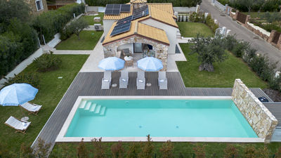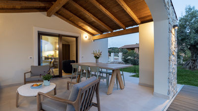 Un giardino a prato verde di 650 mq su terreno pianeggiante incornicia Casa Moros. Direttamente raggiungibile dal living della casa, ospita il portico attrezzato con salotto e tavolo da pranzo e la piscina con la zona solarium. Impreziosito da alberi d’ulivo, garantisce privacy grazie a siepi sempre verdi su tutto il perimetro. A completamento, sul retro, tre posti auto scoperti interni alla proprietà.N.B.: Si precisa che i servizi fotografici solitamente vengono realizzati in primavera, pertanto i colori e le fioriture dei giardini, dei prati e dei parchi potrebbero essere diversi al momento del vostro ingresso in villa.