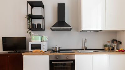 Gli interni dell’appartamento sono stati arredati con stile contemporaneo e pensati per garantire comfort e funzionalità. La zona notte dispone di un’accogliente camera da letto matrimoniale, mentre la zona giorno offre un living moderno e spazioso con divano letto, tavolo da pranzo e una cucina attrezzata con tutto il necessario per preparare ogni pasto. Il bagno è dotato di doccia e rifinito con dettagli eleganti.