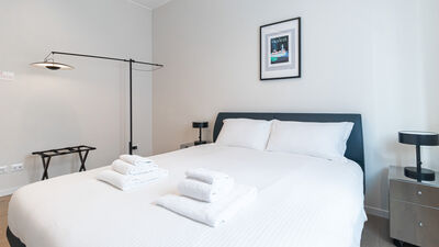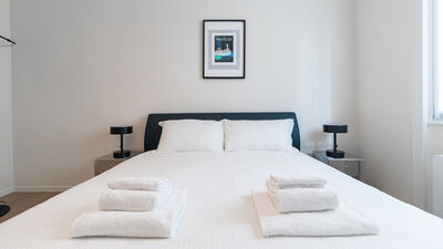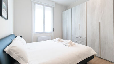 L'appartamento è caratterizzato da una camera da letto con un comodo letto matrimoniale dai toni neutri e rilassanti, arredata con gusto e dotata di ampie armadiature. Il soggiorno presenta un comodo divano letto singolo, perfetto per ospitare un terzo ospite, e si apre su una zona living luminosa con pavimenti in parquet che conferiscono calore e eleganza agli ambienti. La cucina è completamente attrezzata con forno, lavastoviglie e frigorifero con freezer, perfetta per preparare i propri pasti in totale autonomia. Il bagno moderno dispone di una doccia funzionale e finiture di qualità che completano il comfort dell'abitazione.