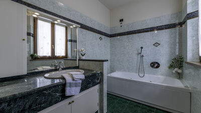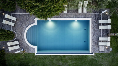La piscina, in posizione panoramica, si trova a circa 20 metri dagli immobili ed è facilmente raggiungibile attraverso il giardino pianeggiante. Di forma rettangolare e con un lato a sfioro; dimensioni 6 x 12 m; profondità variabile tra 1.20 e 1.50 m; rivestita in PVC ALKORPLAN TOUCH con finitura effetto pietra naturale dal colore esotico e accessibile da scala romana; igienizzata con impianto a cloro; recintata con rete alta 1 metro e dotata di cancello di ingresso. Il solarium in porfido è arredato con lettini e ombrelloni. La piscina è servita da una doccia con acqua fredda ed è aperta dall’ultimo sabato di aprile al primo sabato di ottobre.