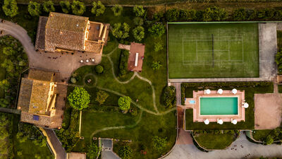 Seimila cinquecento mq di prato verdissimo, alternato a viottoli in pietra e lastricati in cotto fanno da cornice alle due strutture abitative e al meraviglioso outdoor attrezzato che impreziosisce la proprietà, animato da piante di ulivi e da rigogliosi cespugli di essenze mediterranee. Il parco recintato si dipana su una superficie lievemente collinare e super panoramica che accoglie subito all'ingresso una vasta area coperta destinata a parcheggio per otto posti auto. Proseguendo lungo un viale in leggera discesa si raggiunge una larga corte pavimentata in cotto che si sviluppa tra la villa principale e l'annesso, dove all'uscita di ogni suite troviamo freschi porticati attrezzati e panoramiche terrazze ideali per situazioni di convivio, ma anche, in caso di gruppi numerosi, per garantire momenti di tranquillo relax. A pochi passi, attraverso una breve rampa, si raggiungono una terrazza ombreggiata adatta per mangiare all'aperto e un'area destinata al gioco dei bambini con casetta e piccolo scivolo. L'area più riservata della proprietà, anche se non meno panoramica, è occupata dalla meravigliosa piscina e dal campo da tennis.N.B.: Si precisa che i servizi fotografici solitamente vengono realizzati in primavera, pertanto i colori e le fioriture dei giardini, dei prati e dei parchi potrebbero essere diversi al momento del vostro ingresso in villa.