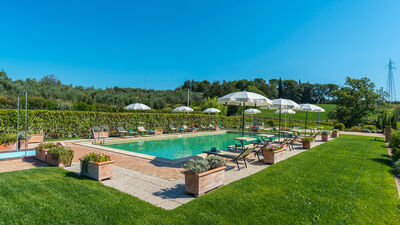 In un’area del parco affacciata su un paesaggio aperto e panoramico è adagiata l'elegante ed esclusiva piscina, distante circa 30 m dai casali e raggiungibile percorrendo un viottolo lastricato nel prato in leggera discesa. La vasca, accessibile attraverso due scalette metalliche, è larga 7 x 15 m ed ha una profondità costante di 1.40 m. Il bordo è in pietra ed è rivestita con piastrelle di mosaico color sabbia. Tutt’intorno si sviluppa il solarium, una larga superficie in cotto su cui sono disposti lettini, sdraie ed ombrelloni. La pool area è recintata parzialmente da siepi e cancellini, ed è accessoriata con lava-piedi e doccia con acqua fredda. Igienizzata a cloro, resterà a disposizione dall’ultimo sabato di aprile fino al primo sabato di ottobre.