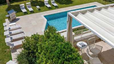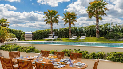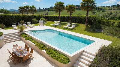 L’accogliente piscina è collocata all’interno del giardino piantumato e garantisce un’assoluta privacy. E’ posta proprio di fronte alla villa e vi si accede alla stessa direttamente dalla casa uscendo dalla zona giorno mediante vetrate scorrevoli molto ampie. La vasca rettangolare irregolare, ha il bordo pavimentato largo 50 cm ed è fornita di scalinata degradante. La piscina misura 11 x 5 m con profondità costante di 130 cm ed è rivestita in piastrelle bianche. L’impianto di depurazione è a cloro e la piscina è dotata di illuminazione sia interna che esterna. La zona solarium è attrezzata con lettini, mentre nel prato ben curato del giardino che la circonda, è possibile soffermarsi per dei momenti di pieno relax o gioco. La piscina è a disposizione dall’ultimo sabato di aprile al primo sabato di ottobre.