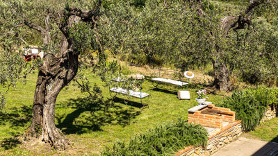 Il giardino è caratterizzato da zone esterne attrezzate e cinte da bordature di piante aromatiche e coloratissimi fiori, il tutto protetto da distese di olivi secolari. Con accesso dalla cucina e dalla sala pranzo si trova una zona esterna lastricata in pietra, che ospita la zona pranzo esterna e la zona living arricchita da comodi divani e poltrone, da questa zona è possibile raggiungere, tramite un percorso lastricato in pietra, la zona piscina e solarium. Nella zona antistante l’ingresso si trova l’ampio parcheggio e un gazebo coperto da un profumato gelsomino.