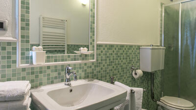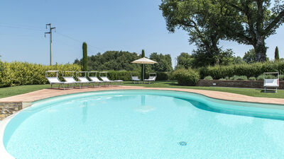 La piscina si trova al centro del prato, a pochi metri dalla casa e dall’annesso; ha una forma irregolare con un lato a sfioro; misura 12 x 6 m con profondità costante di 1,40 m; è rivestita in PVC e bordata in cotto; l’accesso avviene tramite ampi gradini interni, illuminazione notturna; depurazione a cloro. L’area solarium recintata è pavimentata in cotto e circondata da prato, siepi e bassi muretti in pietra, è attrezzata con lettini prendisole, ombrelloni e doccia con acqua fredda. E’ aperta dall’ultimo sabato di aprile al primo sabato di ottobre.