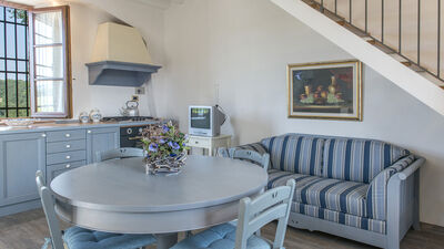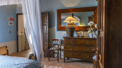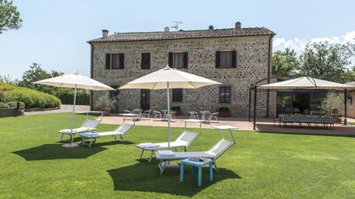 Podere Sant’Eugenio nasce come villa padronale di campagna situata nella Val di Merse, nei pressi del borgo medievale di Chiusdino. In posizione panoramica, la proprietà è circondata da colline boscose e da un giardino curato. Composta da una casa principale e da una annesso indipendente, la villa offre ampi spazi interni ed esterni per accogliere fino a quattordici ospiti (nella versione completa). Arredata nel tradizionale stile toscano, con esterni in pietra arenaria, pavimenti in cotto e mobili d’epoca, dispone di sette camere da letto confortevoli, tutte con bagno en suite, decorate con tonalità tenui. L’area giorno principale comprende un ampio soggiorno open space, cucina e veranda. All’esterno, un gazebo ombreggiato rappresenta il luogo ideale per pranzi all’aperto con vista sul giardino a prato, piantumato con olivi, cipressi e arbusti mediterranei. Al centro del giardino, una grande area piscina recintata rende questa villa particolarmente adatta alle famiglie con bambini piccoli.