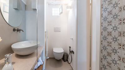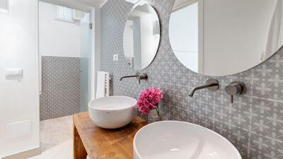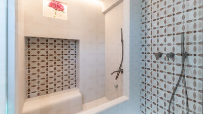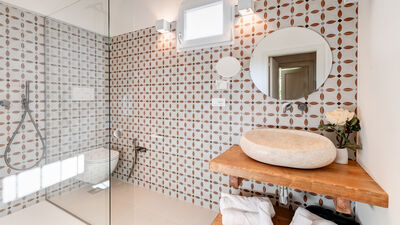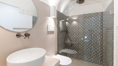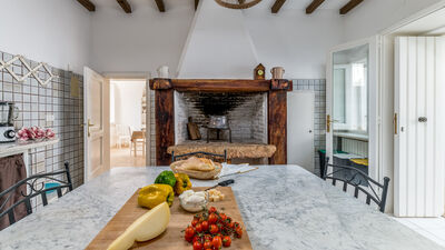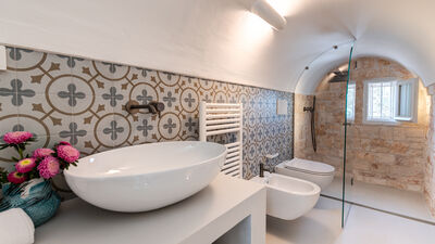 L’immobile è costituito da due unità adiacenti. UNITA’ 1. Si distribuisce su due livelli. L’ingresso apre su un comunicante con due camere singole con bagno en suite di cui uno con doccia e uno con doccia e vasca da bagno, infine una matrimoniale con bagno en suite con doccia. Il piano è completato dalla sala da pranzo con caminetto aperto su due lati e comunicante con la cucina; entrambi gli ambienti hanno accesso diretto sul cortile attraverso porte finestra. Attraverso una scala ripida (di 10 scalini) si accede al piano superiore che ospita una camera doppia (caratterizzata da una bassa volta a botte in pietra di altezza massima 190 cm) e dispone di bagno en suite con doccia. UNITA’ 2. Si sviluppa al solo pianterreno e comprende un salotto e una matrimoniale con bagno en suite con doccia. Aria condizionata parziale (nelle due camere matrimoniali nella camera doppia e nel disimpegno in cui sono collocate due camere singole).
