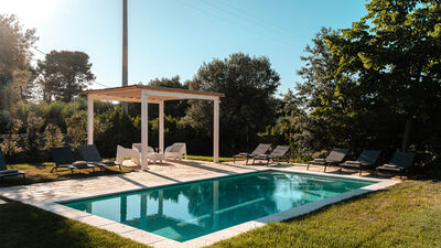 La piscina ad uso esclusivo si raggiunge in pochi passi dagli ingressi della villa. Forma rettangolare a sfioro, con misure 3,5 x 7 m e profondità 1,40 m; rivestita in PVC, con scala romana e pavimentazione perimetrale in pietra; illuminazione sia interna che esterna, doccia con acqua fredda; solarium con gazebo e lettini; igienizzata con impianto a cloro; aperta dall’ultimo sabato di aprile al primo sabato di ottobre.