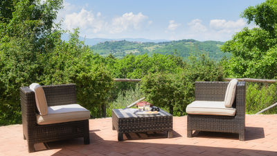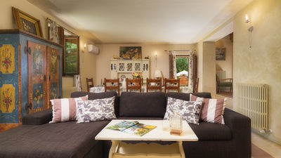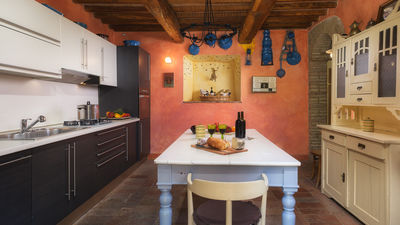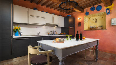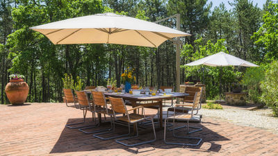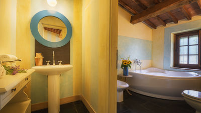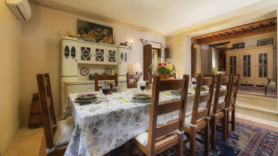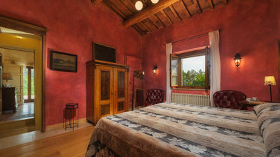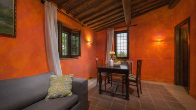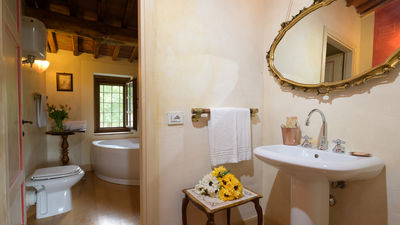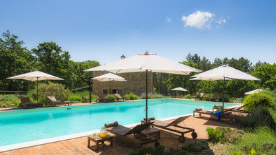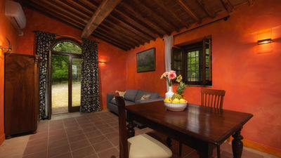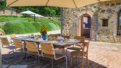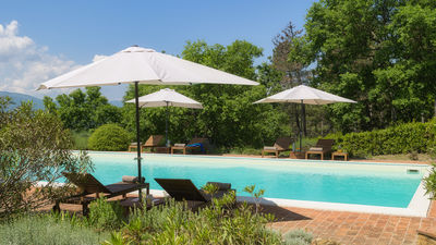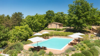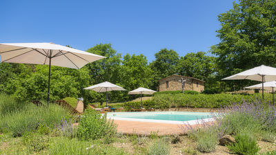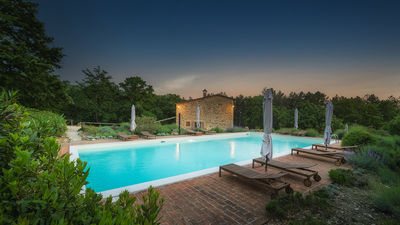 Podere Santa Croce è circondata da aree boschive e si sviluppa su un terreno di 1,7 ettari. Le zone intono al casale e all’annesso sono, in parte, al naturale con querce e pioppi che garantiscono gradevoli zone d’ombra, e in parte coltivate con oleandri, elicrisi, rosmarini e allori. Le terrazze pavimentate, in particolare quella tra il casale e l’annesso è adatta per allestire lunghe tavolate per momenti conviviali. Si accede alla proprietà da una strada sterrata che finisce all’interno della proprietà. Il parcheggio è suddiviso in una zona coperta nel garage (1 posto auto), una zona scoperta (6 posti auto) che sono all’interno della proprietà sul vialetto dietro al casale, in una zona più defilata. Il garage è adibito anche a magazzino (con congelatore a pozzetto) e zona lavanderia. Sotto alla piscina c’è un magazzino ad uso privato sia per il vano tecnico della piscina che per il ricovero di attrezzi e macchinari del podere.N.B.: Si precisa che i servizi fotografici solitamente vengono realizzati in primavera, pertanto i colori e le fioriture dei giardini, dei prati e dei parchi potrebbero essere diversi al momento del vostro ingresso in villa.