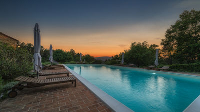 La piscina è situata a 30 metri dal casale e a 30 metri dall’annesso su un terrazzamento pavimentato a cotto e parzialmente recitato da siepi di alloro, oleandro, rosmarino, elicrisi e lavanda. Si accede tramite un vialetto in ghiaia. La piscina è di forma rettangolare, misura 16 x 8 m con una profondità variabile da 1,50 a 2,50 m. Il sistema di depurazione è a cloro ed è rivestita con telo in pvc. La piscina è dotata di illuminazione interna e doccia solare. La piscina è aperta dall’ultimo sabato di aprile al primo sabato di ottobre. L’orario di accesso è dalle 08:00 alle 19:00. Oltre alla piscina si trova, a pochi metri dal casale, la suggestiva vasca idromassaggio riscaldabile per cinque persone aperta tutto l’anno.