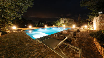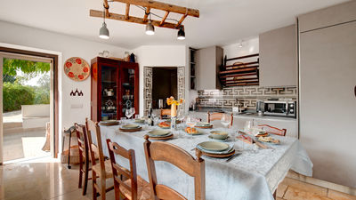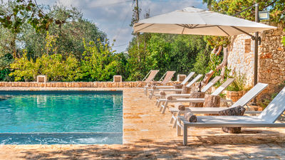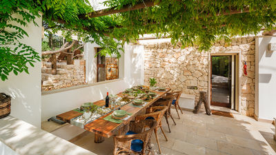 Villa Giari è una villa di recente ristrutturazione su due piani, situata appena fuori dal centro storico di Ceglie Messapica, in posizione panoramica tra la Valle d’Itria e l’Alto Salento. Circondata da un ampio e rigoglioso giardino, la villa unisce praticità e comfort moderni al carattere tradizionale, offrendo spazi ben organizzati e una scelta di ambienti interni ed esterni. La disposizione comprende quattro camere da letto, una veranda arredata, due cucine e due soggiorni, uno per ogni piano. All’esterno, il terreno ospita querce secolari, una piscina immersa tra alberi da frutto e arbusti fioriti, uno stagno con piante acquatiche e un’area giochi per bambini. A disposizione tre aree pranzo ombreggiate, con forno a legna e barbecue. Ideale per tutte le età, la posizione è perfetta come base immersa nella campagna, vicino a città storiche e spiagge.