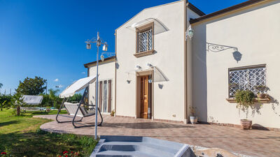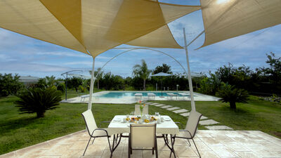 La piscina si trova a pochi metri dalla villa, raggiungibile tramite un breve sentiero dalle porte-finestre della zona giorno. Di forma rettangolare; misura 10 x 5 m; profondità da 1,20 a 1,40 m; rivestita in PVC; sistema di purificazione al cloro; zona idromassaggio; cascata ornamentale; accesso con scala romana e scaletta in metallo. Solarium pavimentato in cotto, con lettini e ombrelloni; doccia esterna con acqua calda e fredda. L’illuminazione interna ed esterna consente l’utilizzo anche nelle ore serali. La piscina è aperta dall’ultimo sabato di aprile al primo sabato di ottobre.
